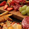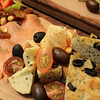 Variedades de quesos artesanales especiados, salame, salmón ahumado, pasas rubias, aceitunas, queso untable sabor, mermelada de higo nuez, galletas saladas, tostadas y frutas de estación.